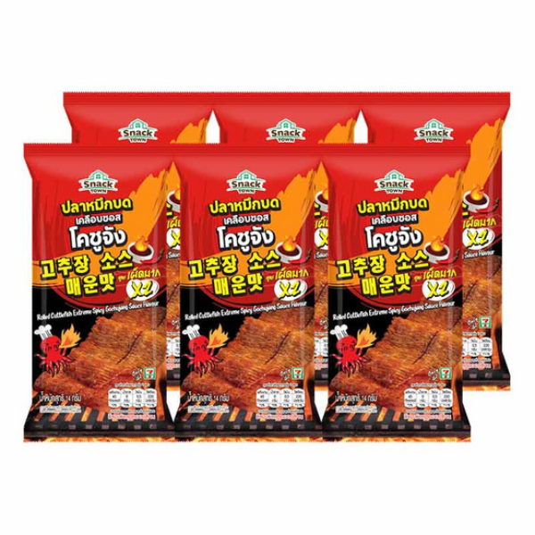 สแนคทาวน์ ปลาหมึกบดเคลือบซอสโคชูจัง สูตรเผ็ดมาก (14g x 6 ซอง)